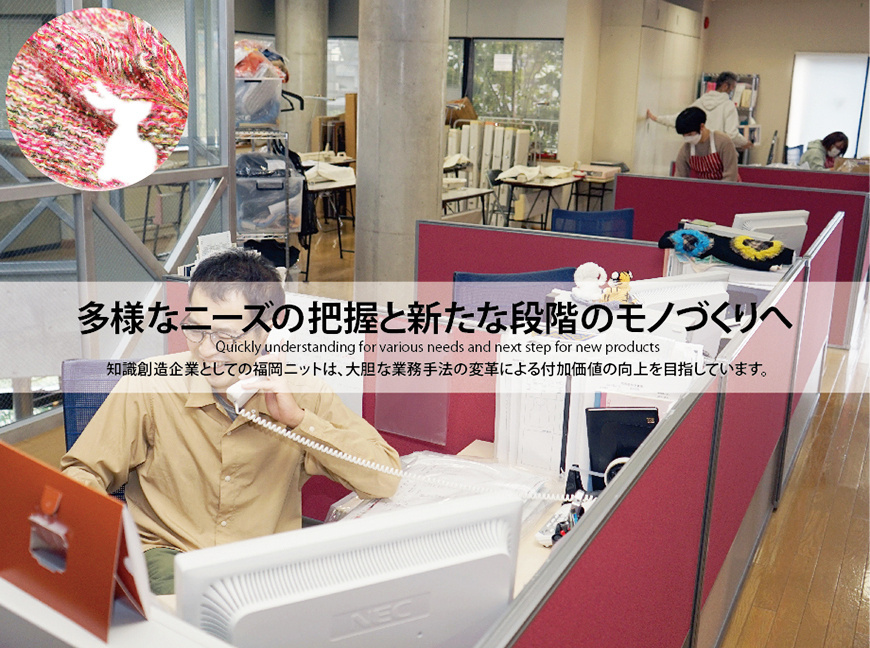 福岡県筑紫野市に本社を、中国上海近郊に独資工場を持つ弊社は、手編み、家庭機、手横機、自動機を中心として、布帛・カットソー・レザーなどとの異素材との縫製等、種々の手法を用いてニット製品やパーツ(モチーフ等)を受注生産する会社です。素材やテキスタイル等、幅広くお客様のご要望に添ったご提案をさせて頂きます。中国進出45年のノウハウを生かした人材と技術と設備、本社と工場をオンラインでつないだ徹底した納期管理で、高品質な製品づくりをご支援致します。