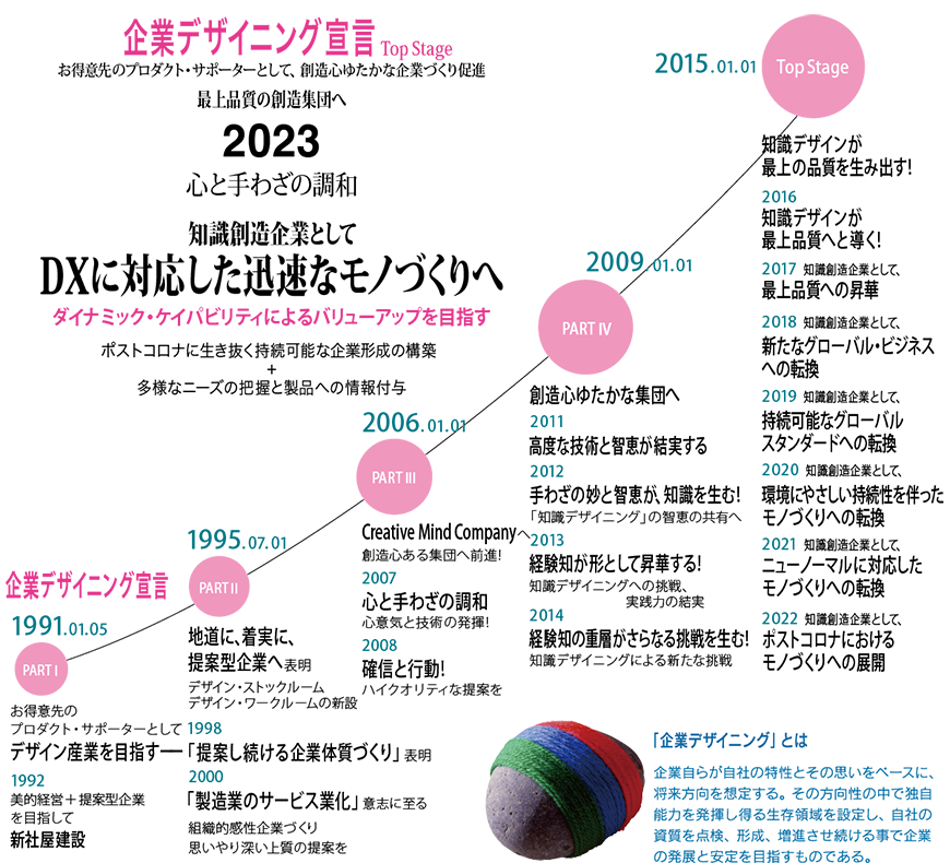 福岡ニットは、熟練した職人の技により洗練された品質を創り出すと共に、日々の知識と経験を積み重ね、資産として参りました。これらの経験は、手わざが育むコツと智恵を「心と手わざの調和」として、ニットの豊かな可能性と多彩なバリエーションを編み出しています。永らく積み重ねた経験知は、知識産業としての福岡ニットへと飛躍を促しています。そして積み重ねた知識と技術が、最上の品質を生み出す新たなダイナミズムを構築しています。社内スタッフの迅速な情報共有により構築された経験知は、重要な製品情報として充実しつつあります。福岡ニットの高度な経験知と専門性によるデザイン思考は、フィジカルワークとしての製品製造から熟練の技術と知識を収集し、かつデータとして蓄積することを促しています。